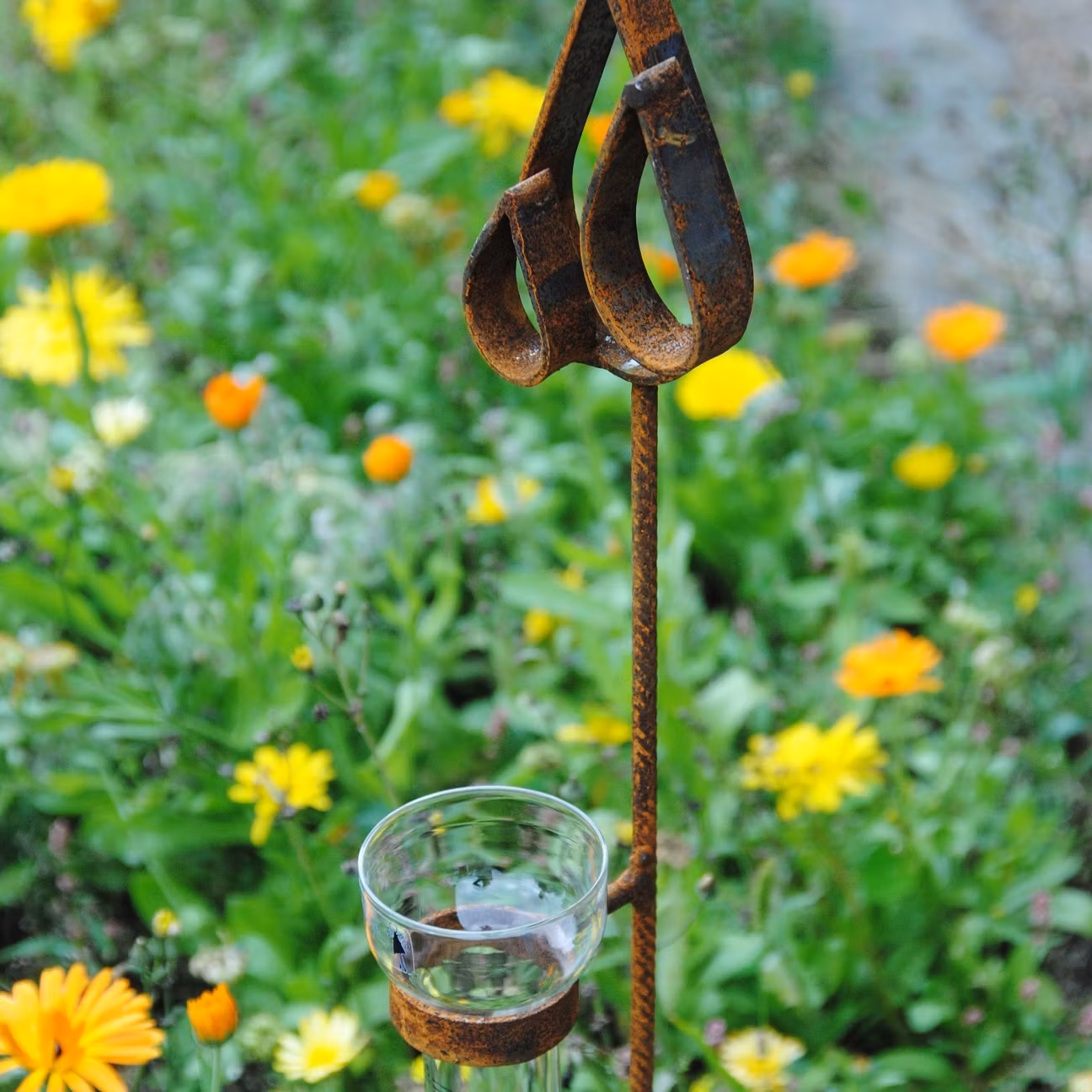 Regnmätare Droppar av rostigt stål. Till nytta och glädje i din trädgård.