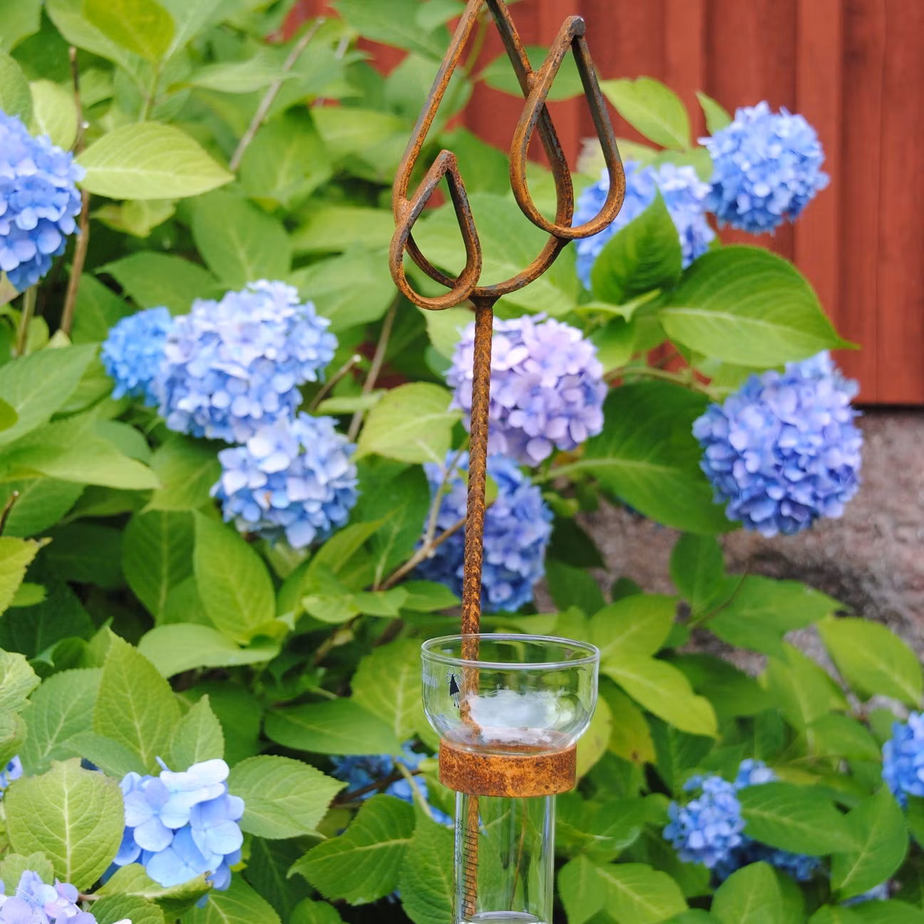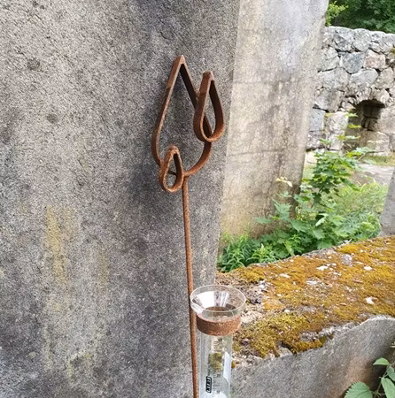 Formad och svetsad för hand i smedjan i Killeboda, Mätglas i glas eller plast. Snygg, hållbar och rejäl regnmätare.