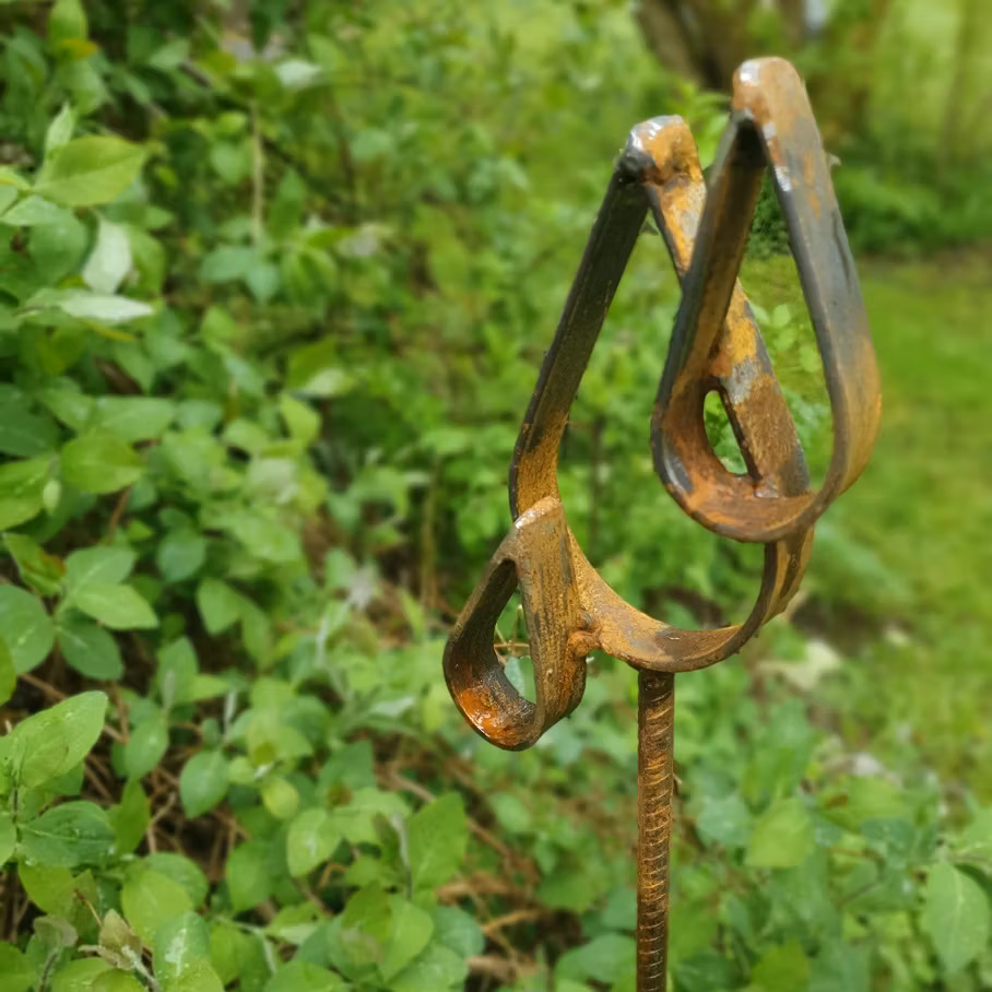 - Formad och svetsad för hand, på armeringsjärn att sticka ner i jorden.