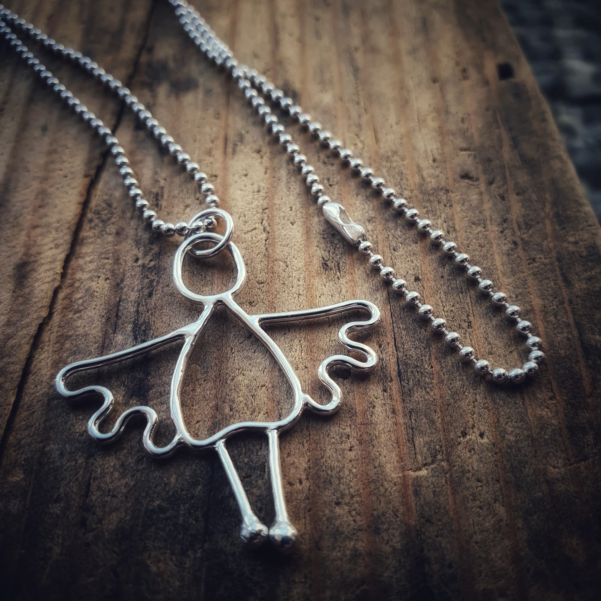 Alva, med kropp sågad ur silverplåt, är störst och har fått namn efter en rar liten tös, kusinbarnet med de fina lockarna och spring i benen. Silverängeln Alva passar bäst i de längre kulkedjorna och blir ett snyggt långt halsband.