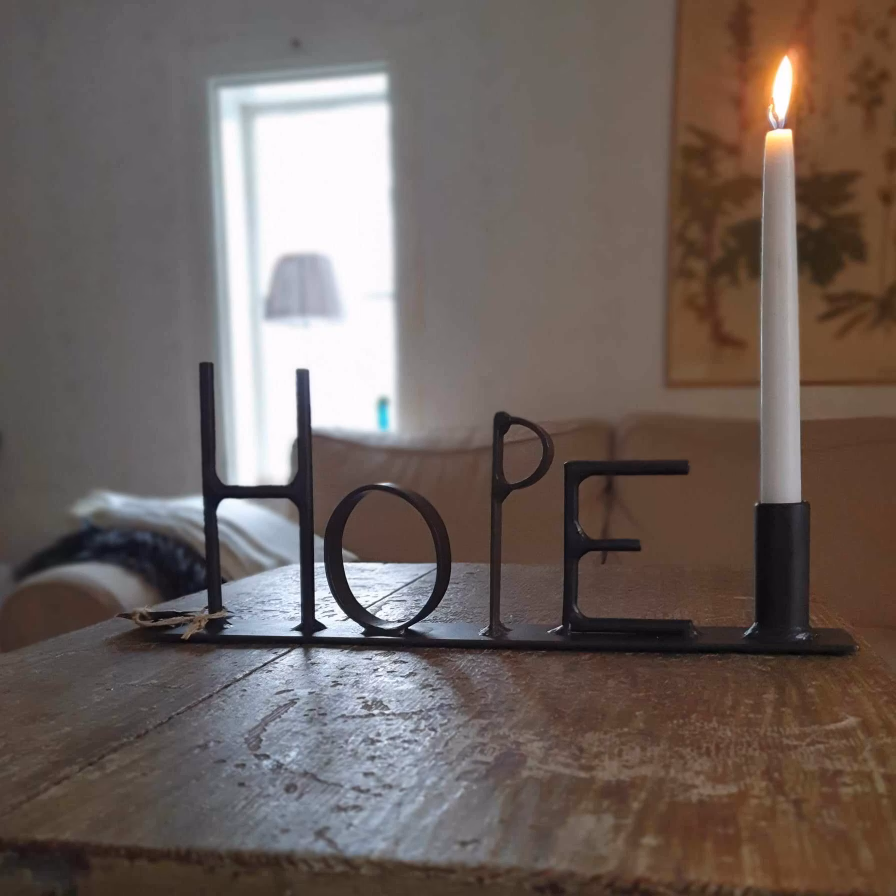 Hopp och ljus med handgjorda ljusstaken HOPE. Linoljebränt smide från smedjan i Killeboda.